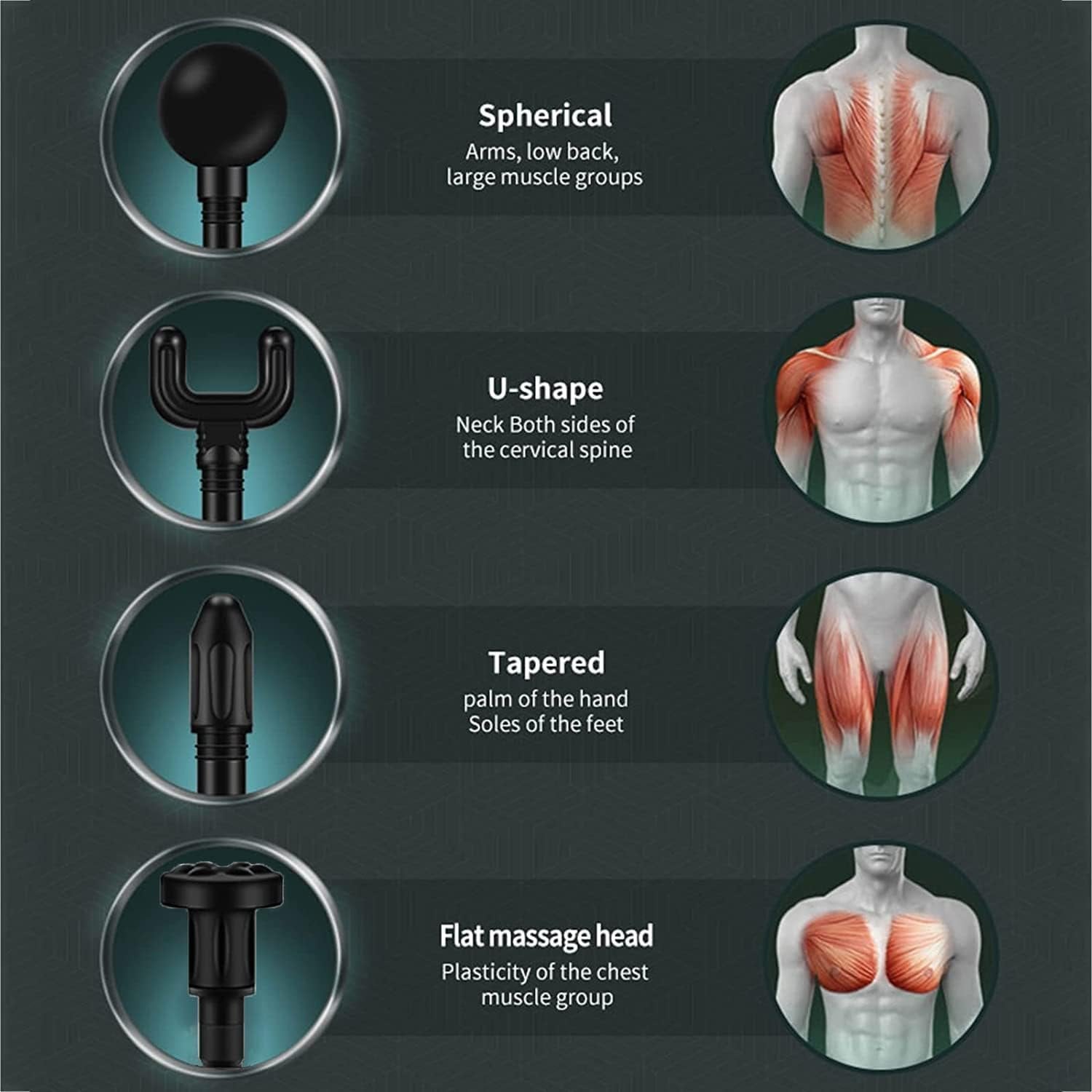 Four Specialty Massage Heads Interchangeable heads in 4 shapes to target specific muscle groups for faster Recovery, Easy & Quick to Remove and fix massage heads in seconds.